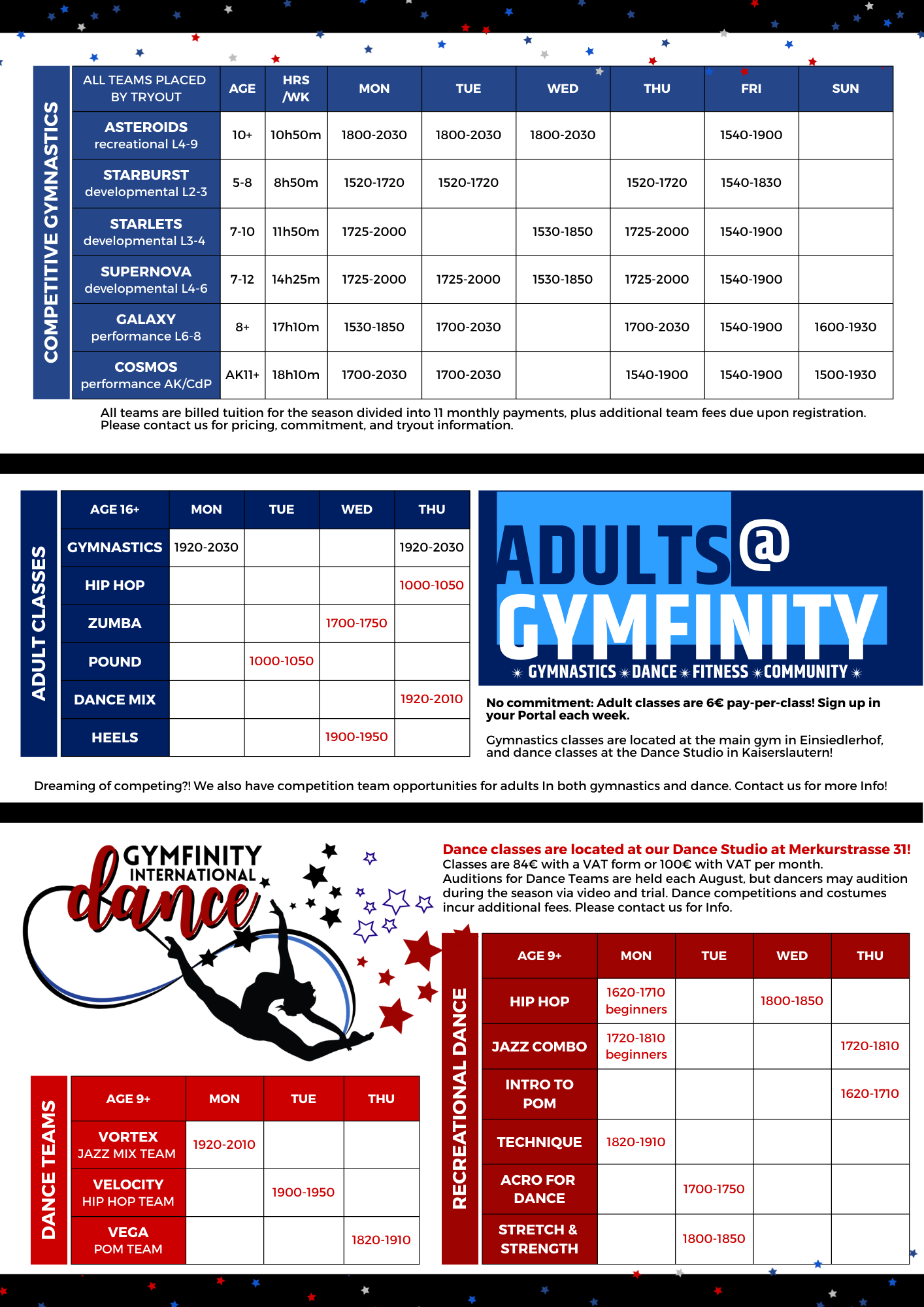Gymfinity’s Competition Teams include developmental, performance, and recreational teams, and accommodate the equivalent of USAG levels 3-10 and Xcel, as well as German AK11+ and LK3-LK1 levels. Teams practice between 6 and 20 hours per week and compete in various programs including the German DTB system, Bundesliga, American USAG and Xcel, IAIGC/USAIGC, FIG, and other independent international organizations, depending on the competition selection for the year. All placements are through a formal tryout only. Incoming families may submit a video or previous competition results for temporary placement until the athlete can be evaluated.